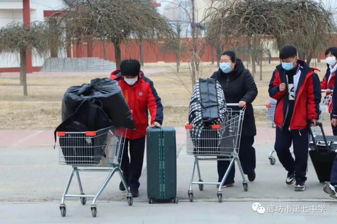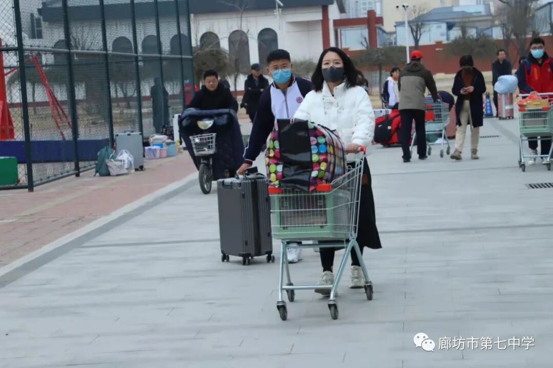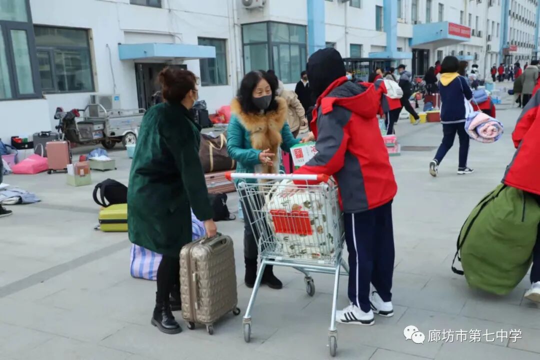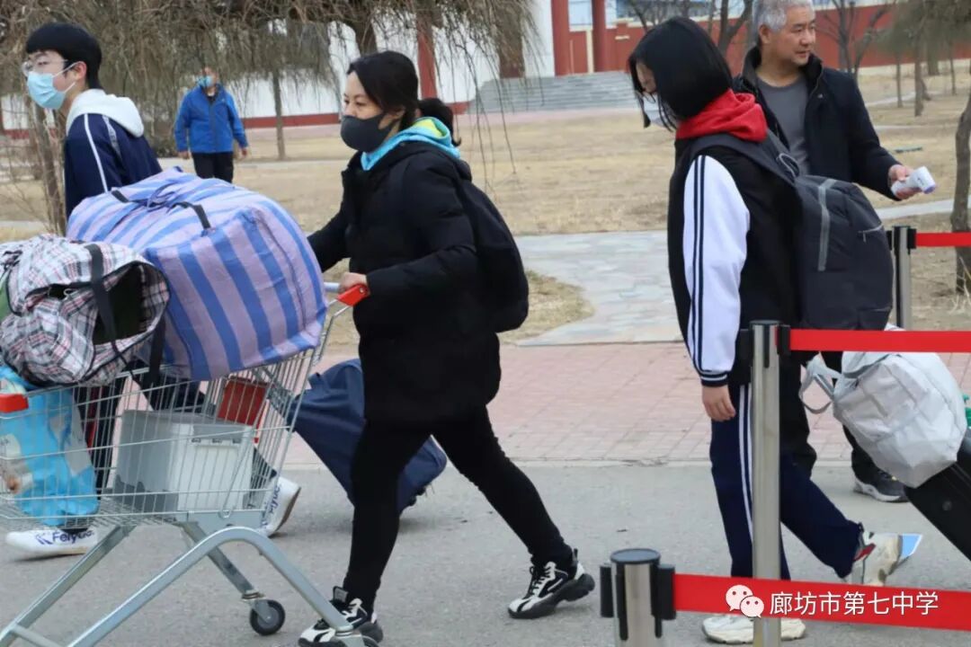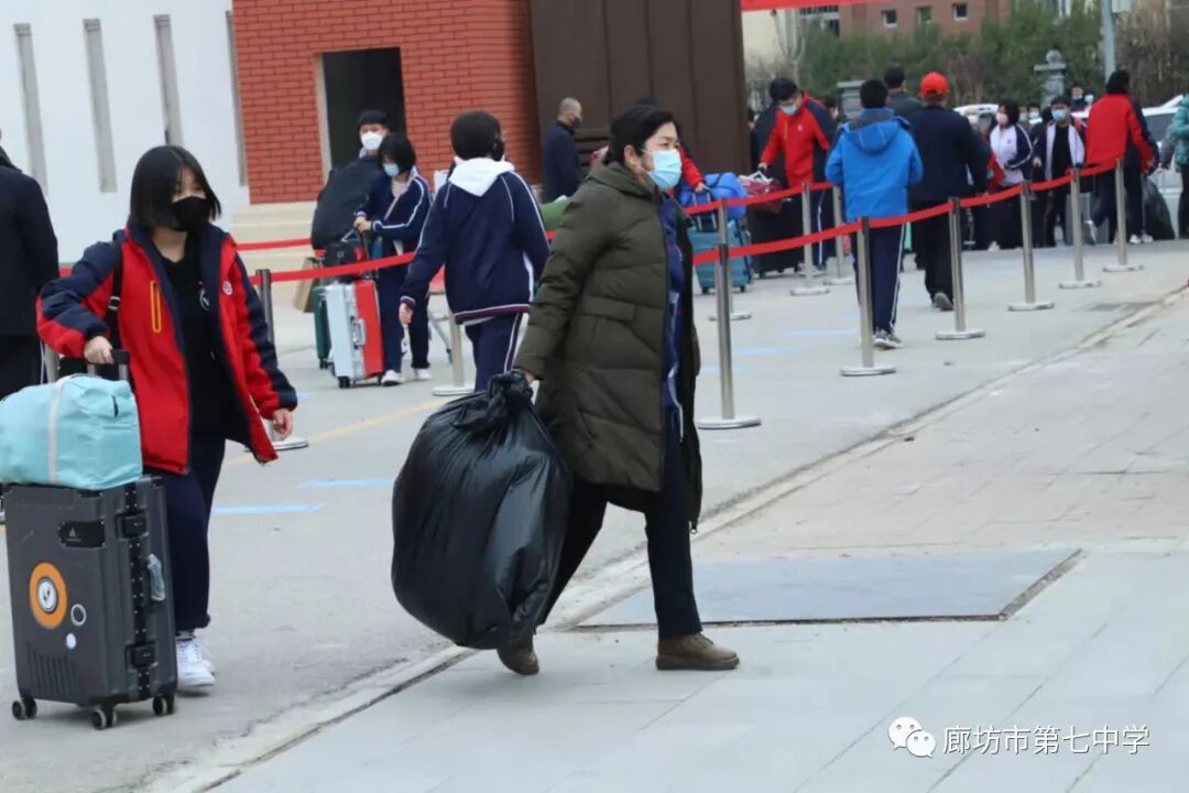 2022年2月28日,廊坊七中实施错峰开学返校,春暖花开学子归来,沉寂的校园重焕勃勃生机。按照防疫要求,家长不能入校,老师们主动接过了帮学生搬运行李的接力棒。