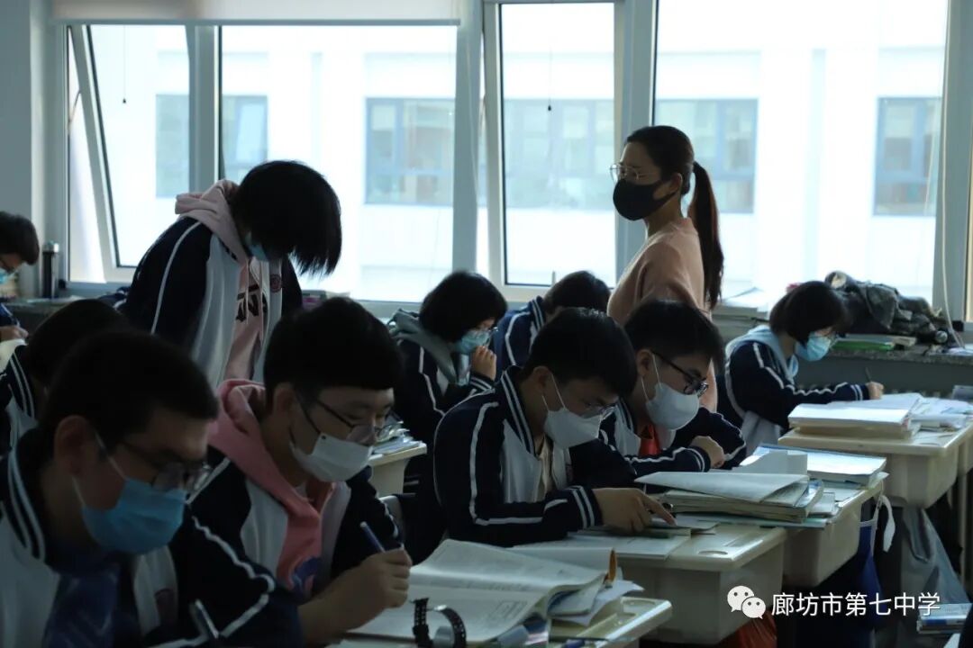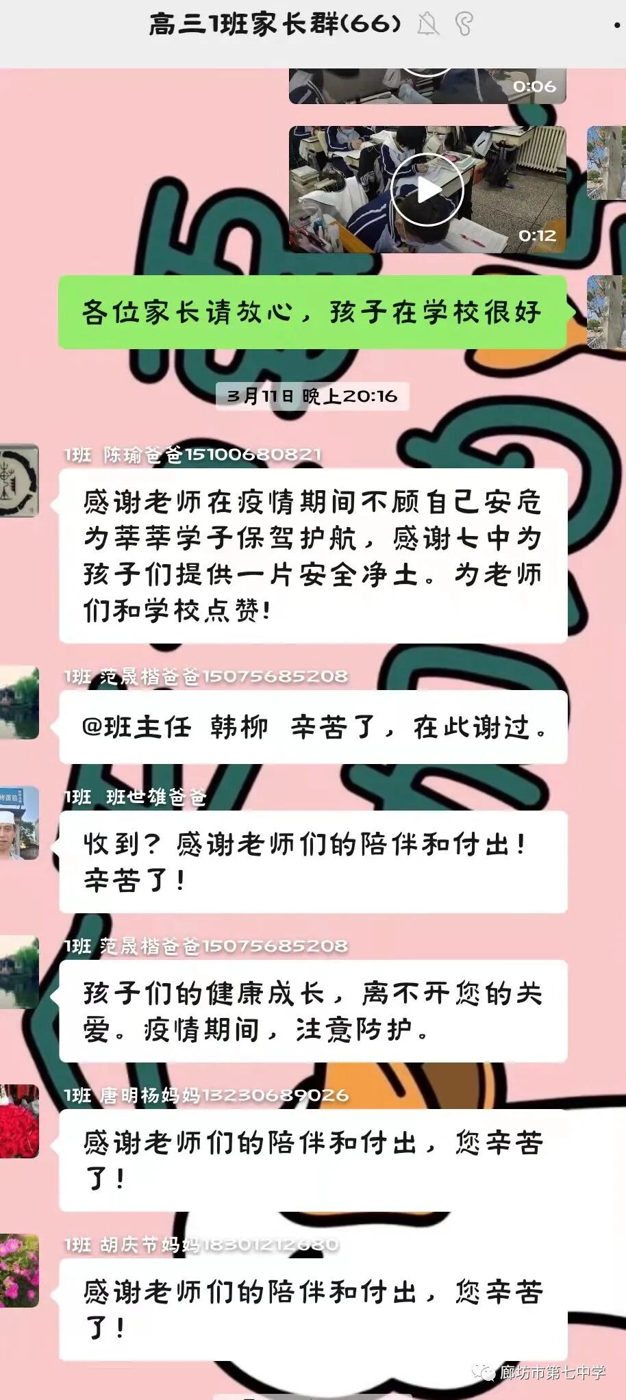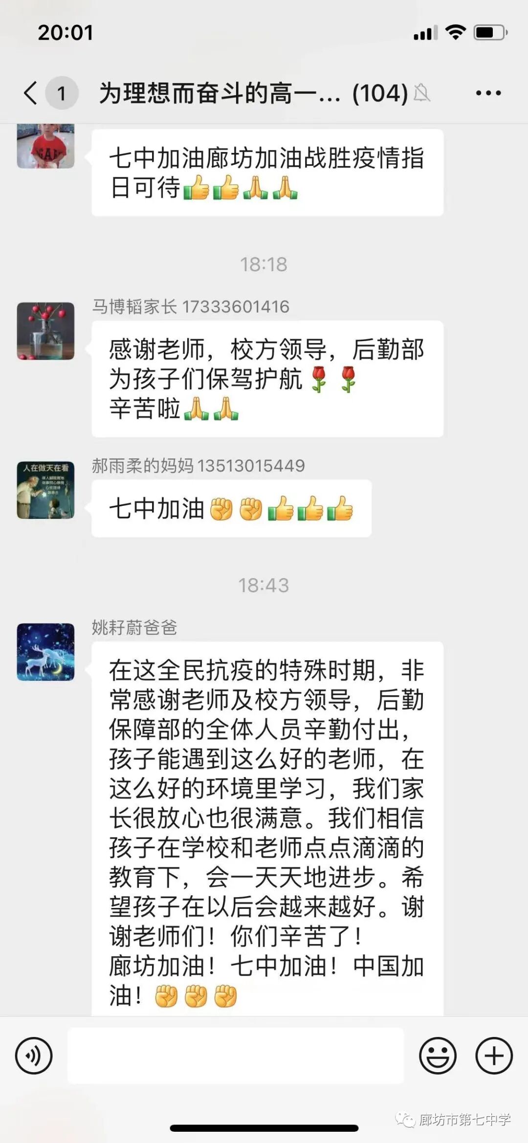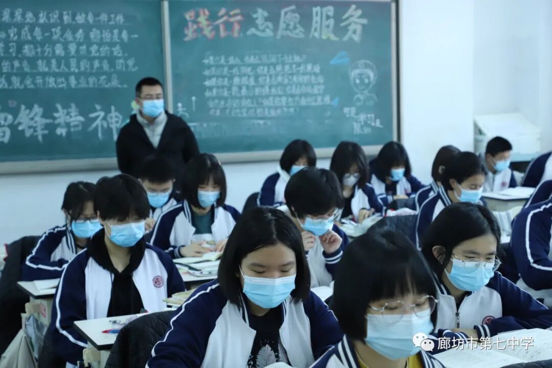 面对疫情发展新形势,学校迅速响应,高中部全体学生1800人,自2022年3月9日起实行全封闭管理。领导班子、中层干部、100多名教师、后勤保障人员主动请缨,舍小家为大家,他们来到校园与学生一起共克时艰,吃住在学校,杜绝与外界接触,积极响应学校号召:疫情当前,课堂就是战场,守护学生就是廊坊七中教师们的使命!