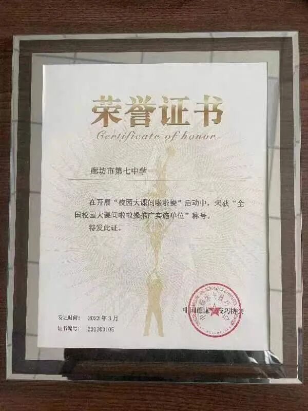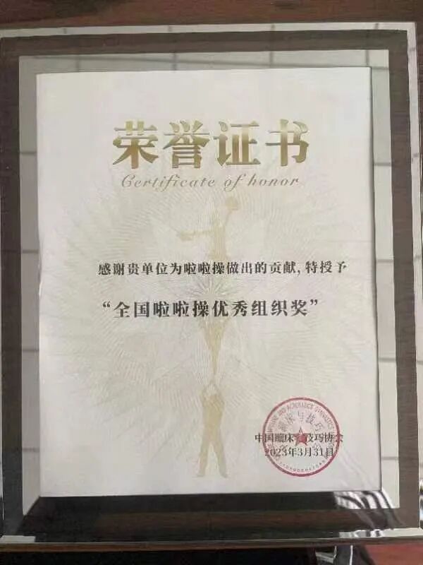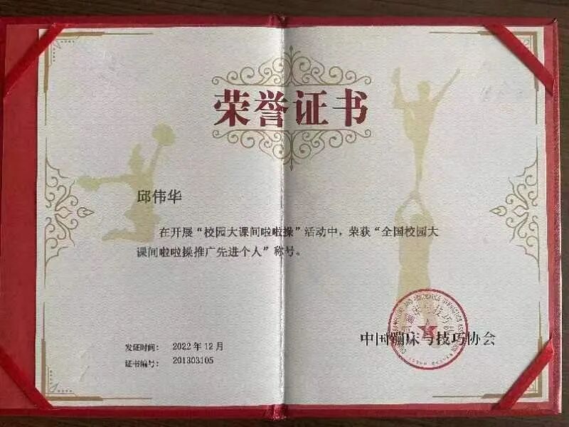 国家体育总局体操管理中心、中国蹦床与技巧协会对我校啦啦操项目推广给予了充分肯定,对我校体育工作及成果表示高度认可,并在中国啦啦操文化纪中为我校颁发全国校园大课间啦啦操推广实施单位、全国啦啦操优秀组织奖奖牌,邱伟华老师在荣获全国校园大课间啦啦操推广先进个人。