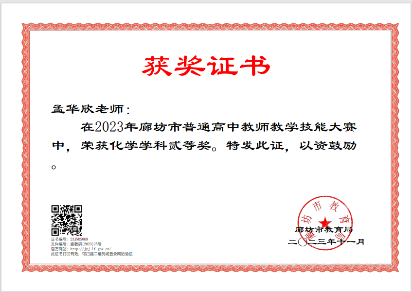 孟华欣,高中化学教师,研究生学历,毕业于东北师范大学化学系。她工作态度积极主动,始终奋斗在教学一线,爱岗敬业,认真负责,所带班级学习成绩突出,班风优良。在教学工作中,她多次获得“优秀备课组长”、“成绩优秀教师”等荣誉称号。工作中始终保持高度的事业心和责任感,以饱满的工作热情,踏实的工作作风,优异的工作成绩,赢得了同事、学生和家长的信任和肯定。