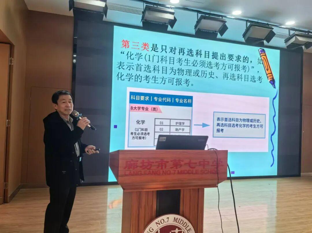 未雨绸缪新高考,科学选科路先行。为了帮助高一学生树立生涯规划意识,找准自身发展方向,科学规划选科,合理谋划学业,及早明确自己的学业目标,为未来的学习奠定坚实的基础,11月17日,廊坊七中成功举办了一场以《规划青春,成就未来——高一年级生涯规划》为主题的专题讲座。本次活动由河北省特级教师李清利老师主讲,高一年级学生家长和教师,参加了此次讲座。